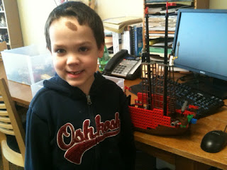 You will notice he is sans glasses. They broke a week or two ago and we are waiting for the new pair. This will be his 3rd pair since he started wearing them in October of 2010. Daniel was very excited about this pirate ship he built at his Play therapy. He is very interested in pirates right now and this is the toy he goes for everytime at Play therapy.